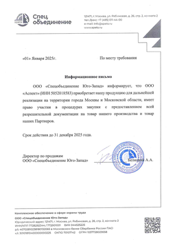 Отдельно хотели бы отметить отличный сервис, вежливость и отзывчивость Ваших сотрудников, проявленные при поставке спецодежды и средств индивидуальной защиты. Сотрудничество с Вами, позволяет нам значимо экономить рабочее время и направлять его на развитие собственной компании. Достигнутые совместно с Вами успехи помогли нашей компании добиться превосходных результатов в работе, сделать важные шаги по реализации стратегии достижения Скорости, Качества и Высокого Сервиса. Вашу компанию отличает системный подход, оперативность и эффективность в решении возникающих задач любой сложности. Верю в сохранение сложившихся деловых отношений и дальнейшее взаимовыгодное сотрудничество. Желаю Вашей компании успешного развития и достижения новых вершин в бизнесе.