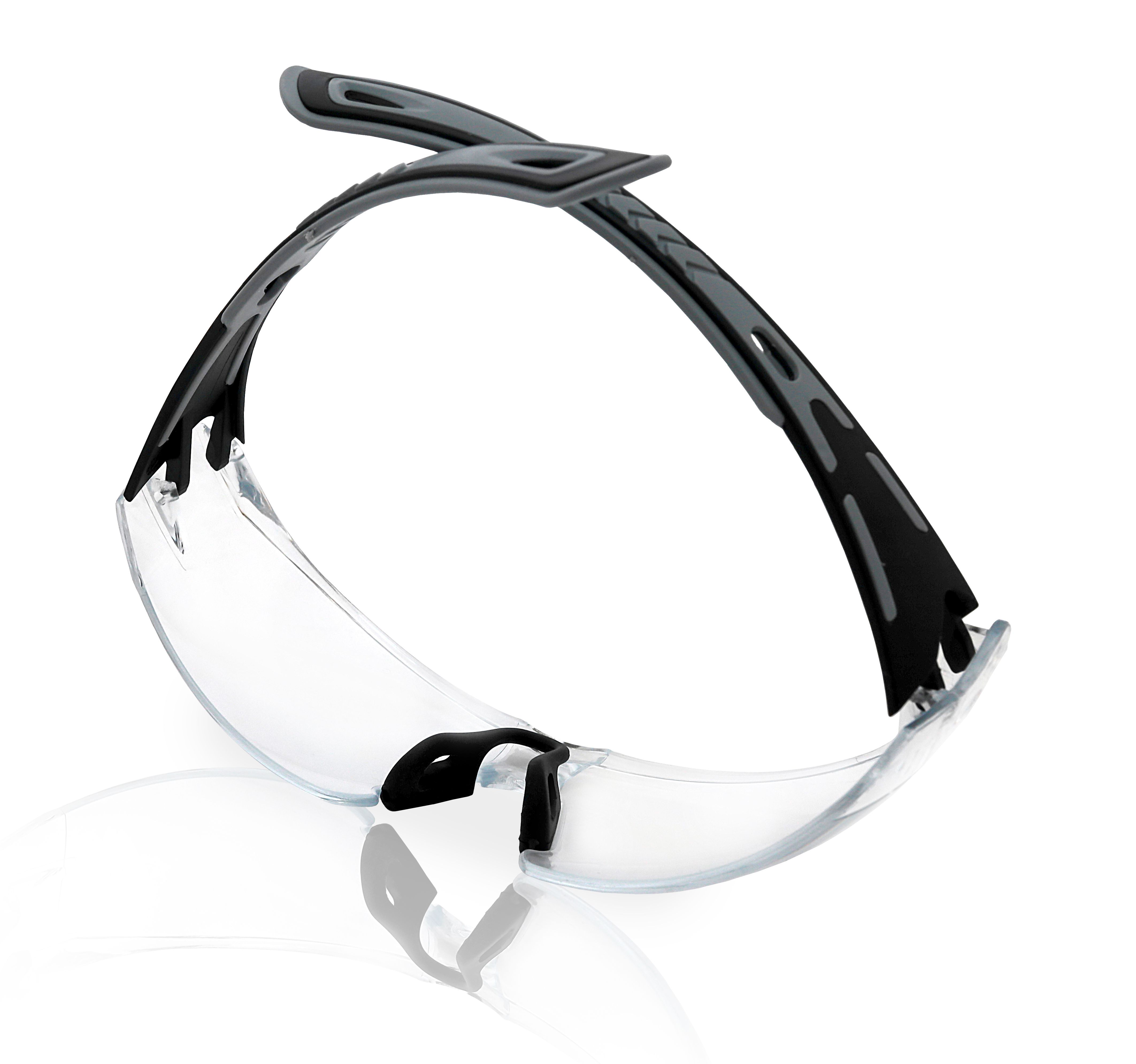 Защитные очки последнего поколения с двухцветными мягкими дужками, сделанными с применением инновационного материала ТЭП (термоэластопласт), с панорамными линзами, которые обеспечивают улучшенный обзор и защищают глаза от попадания летящих частиц.